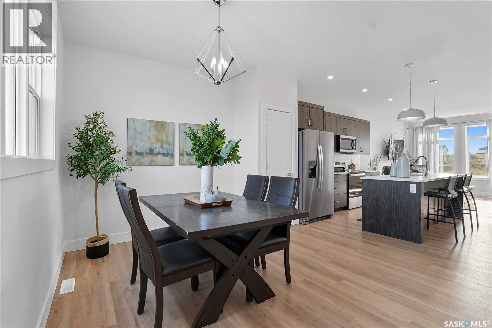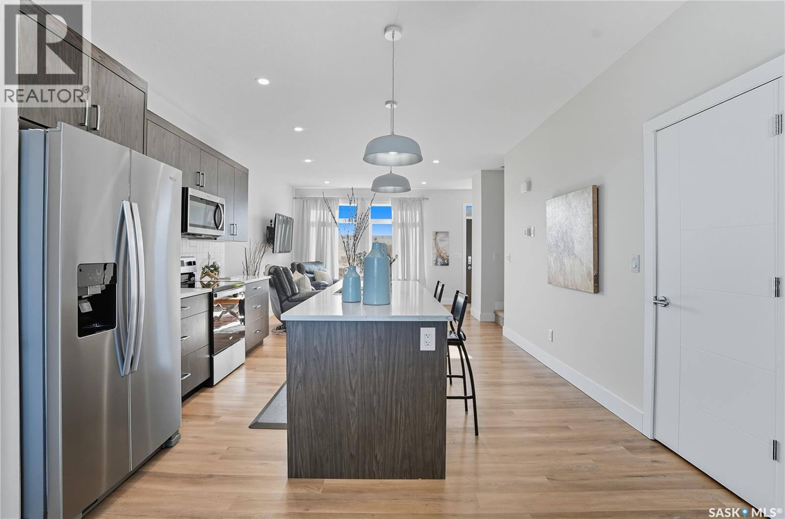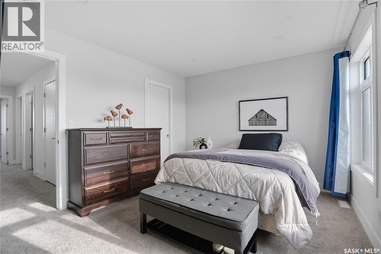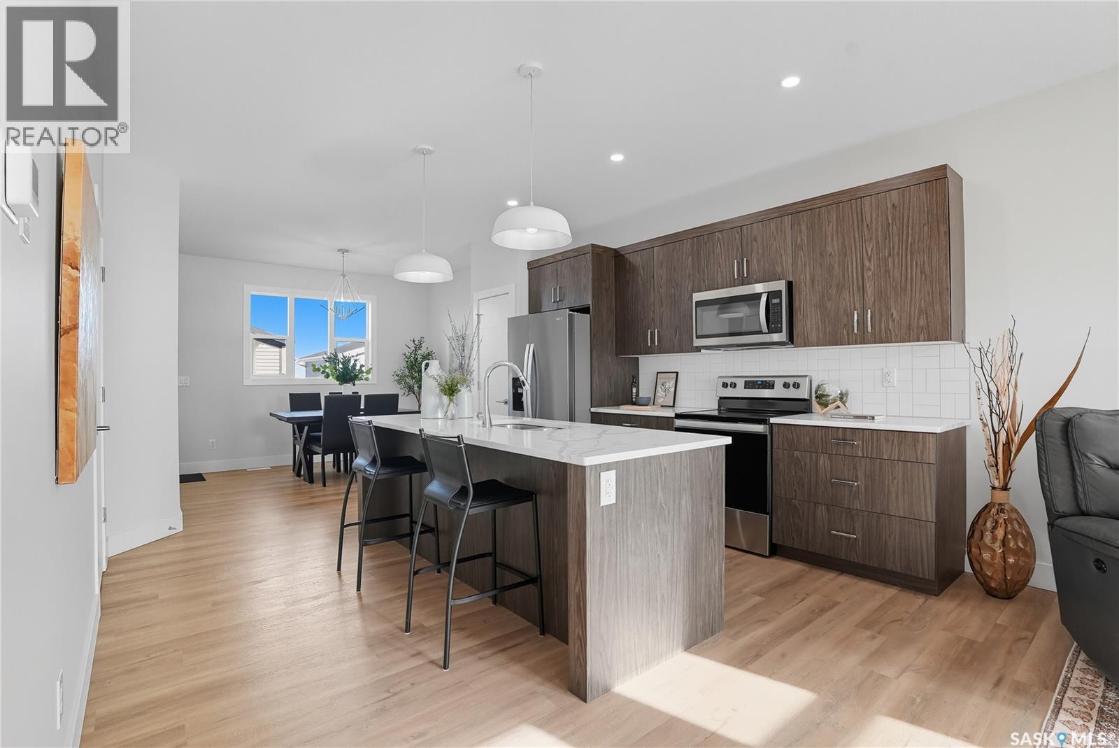 Welcome to 723 Henry Dayday Road, a stunning two-storey home that blends modern design with everyday comfort. Flooded with natural light, this home offers an inviting open-concept layout perfect for both family living and entertaining. Step inside to a stylish foyer with built-in bench seating that leads into the bright living room and contemporary kitchen, featuring quartz countertops, soft-close cabinetry, stainless steel appliances, and a large island with seating. The adjoining dining area offers the perfect gathering space, while a convenient two-piece powder room completes the main floor. Upstairs, you’ll find three spacious bedrooms, a full bathroom, and laundry for added convenience. The primary suite is a true retreat with a generous walk-in closet and an ensuite boasting dual vanities and a walk-in shower. A separate side entrance offers excellent potential for a future basement suite, ideal for guests or added income. Outside, enjoy a fully landscaped front yard with underground sprinklers, a fenced backyard, a back deck with natural gas BBQ hookup, and two car detached garage. Located in Aspen Ridge, one of Saskatoon’s most desirable new communities with quick access to amenities and the Chief Mistawasis Bridge. (id:4069)