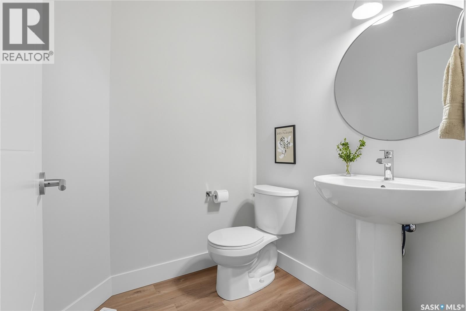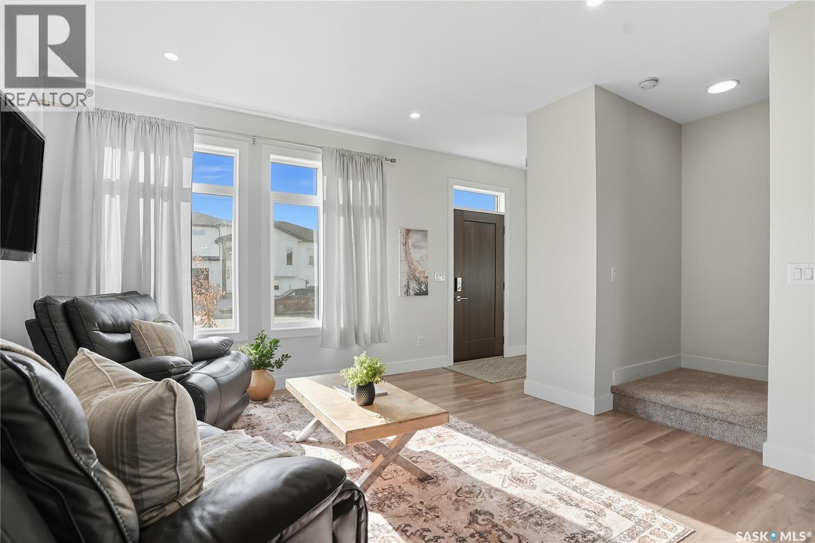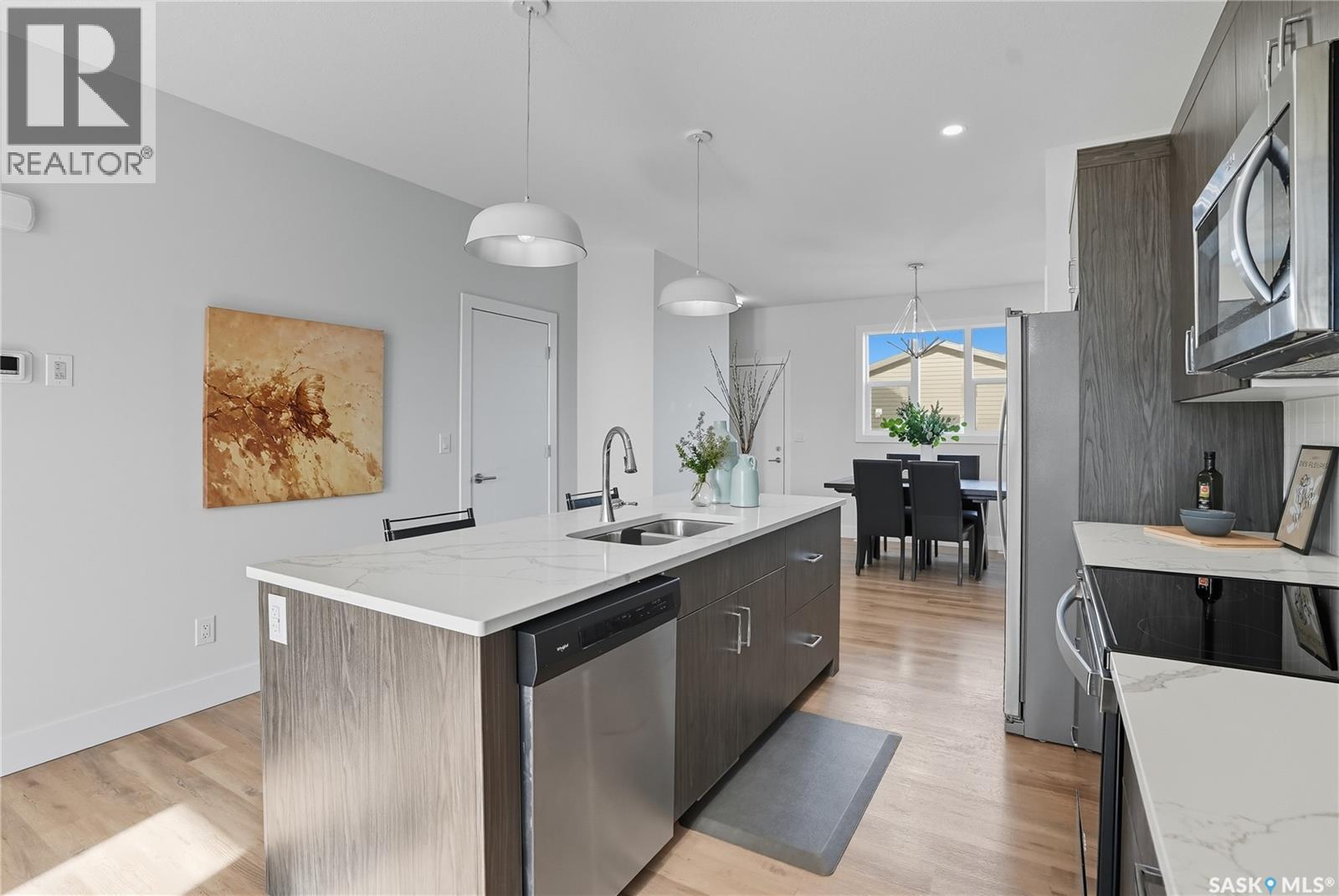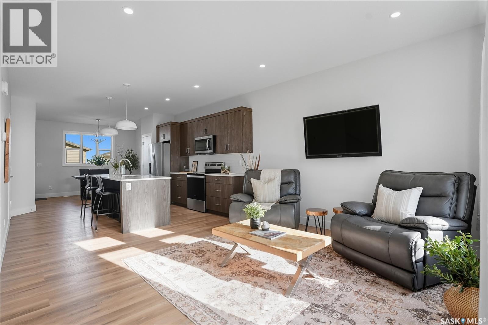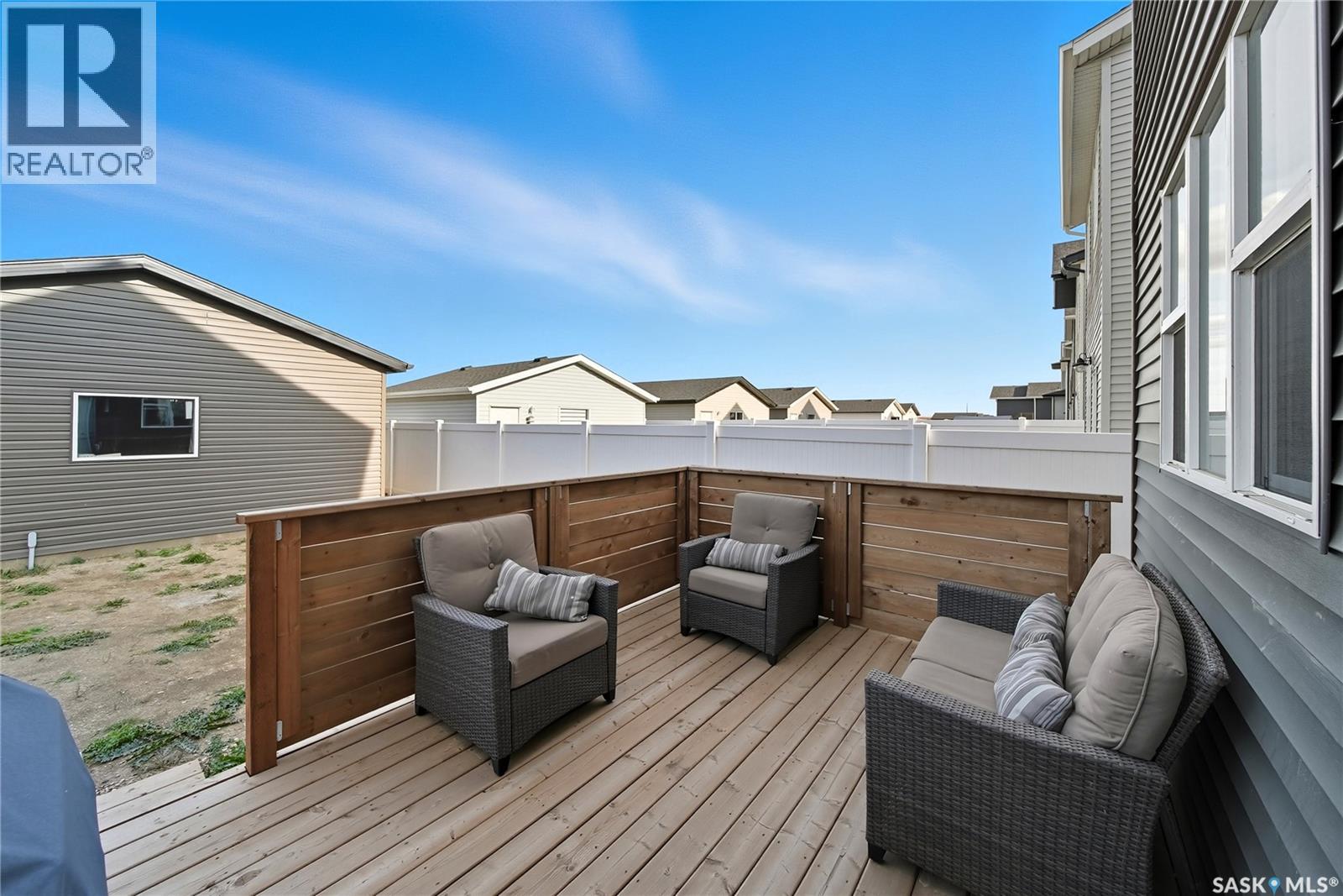 Welcome to 723 Henry Dayday Road, a stunning two-storey home that blends modern design with everyday comfort. Flooded with natural light, this home offers an inviting open-concept layout perfect for both family living and entertaining. Step inside to a stylish foyer with built-in bench seating that leads into the bright living room and contemporary kitchen, featuring quartz countertops, soft-close cabinetry, stainless steel appliances, and a large island with seating. The adjoining dining area offers the perfect gathering space, while a convenient two-piece powder room completes the main floor. Upstairs, you’ll find three spacious bedrooms, a full bathroom, and laundry for added convenience. The primary suite is a true retreat with a generous walk-in closet and an ensuite boasting dual vanities and a walk-in shower. A separate side entrance offers excellent potential for a future basement suite, ideal for guests or added income. Outside, enjoy a fully landscaped front yard with underground sprinklers, a fenced backyard, a back deck with natural gas BBQ hookup, and two car detached garage. Located in Aspen Ridge, one of Saskatoon’s most desirable new communities with quick access to amenities and the Chief Mistawasis Bridge. (id:4069)